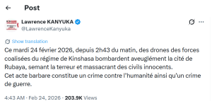 He added: “This Tuesday, February 24, 2026, at precisely 7:00 a.m., its coalition forces launched deliberate attacks against densely populated areas of Kitendebwa, Kashihe, and Kiduveri in Kalehe territory. These attacks, which are still ongoing, demonstrate the regime’s intent to sow terror and chaos among the civilian population.”